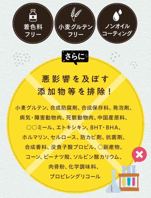 また、着色料や合成保存料など悪影響を及ぼす恐れのある成分を排除しているので大切なチェックポイントです!