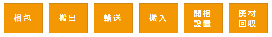 デカ宅の基本サービスは「梱包・搬出・輸送・搬入・開梱設置・廃材回収」の6つです。